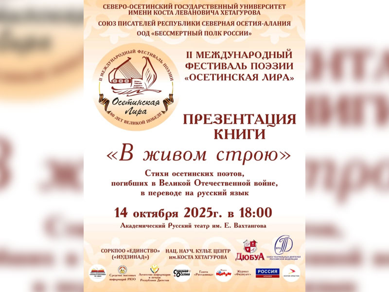 Сборник «В живом строю» представят читателям 14 октября, в Русском академическом театре им. Е. Вахтангова. В книгу вошли стихи осетинских поэтов, погибших на фронтах Великой Отечественной войны. Юные поэты, вставшие на защиту Родины, не успев пожить, оставили яркое и необычайно светлое, пронизанное любовью к родному краю, литературное наследие. Многие стихи переведены на русский язык и опубликованы впервые. Эту книгу из серии «Победа – 80» дарит читателям московское издательство «Челнок», которое при содействии Совета молодых литераторов Союза писателей России выпустило ее бесплатно. Подстрочные переводы с осетинского языка на русский выполнили поэт и переводчик Залина Басиева и член Союза писателей России Казбек Мамукаев. Редактор-составитель книги – профессор Челябинского государственного института культуры, поэт и переводчик Нина Ягодинцева.