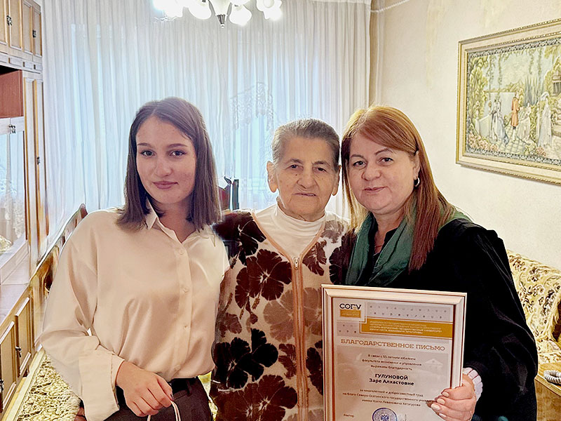 В первый октябрьский день, когда во всем мире чествуют людей «серебряного» возраста, в знак глубокого уважения и внимания к людям старшего поколения преподаватели и студенты факультета экономики и управления Северо-Осетинского государственного университета им. К.Л. Хетагурова посетили на дому ветеранов этого факультета и поздравили их с добрым и светлым праздником, пожелав здоровья, тепла, любви близких людей, счастья и благополучия.