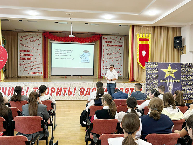 На занятии старшеклассники смогли не только задать вопросы о выборе профессии, совмещении гуманитарных и технических наук, возможностях дальнейшего обучения и карьерного роста в ИТ, но и пройти специальный тест по определению профессиональных склонностей на основе личностных качеств.