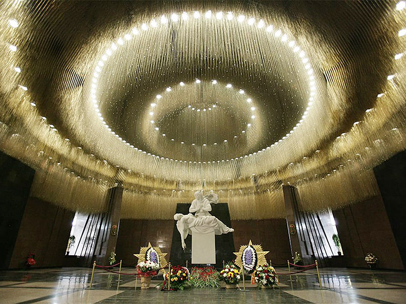 Зал памяти и скорби. Два миллиона семьсот тысяч бронзовых подвесок с десятью хрустальными «слезами» под потолком. По одной на каждые десять погибших бойцов