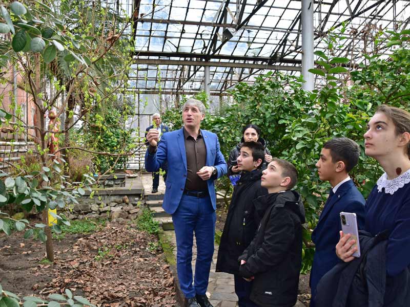 Программа дня включала 12 тематических площадок, где школьники могли напрямую пообщаться с учеными и преподавателями. Особый интерес вызвала оранжерея ГГАУ. Она была построена еще в 1991 году под руководством профессора Азана Газданова. Сейчас его традиции продолжаются, оранжерея регулярно пополняется новыми интересными видами растений. Доценты кафедры агрохимии и семеноводства Заурбек Кануков и Хазби Кокоев провели для ребят живой урок по субтропическим культурам. Учащиеся увидели цитрусовые растения (апельсин, мандарин, лимон, грейпфрут), гранат, инжир, мушмулу японскую, лавровое дерево, хурму. Все это бережно выращивается преподавателями вуза и даже удобрения для деревьев делают сами. Детям объяснили, почему эти растения не выживут в открытом грунте в местных условиях и как в оранжерее для них создается искусственный микроклимат с оптимальным температурным режимом и влажностью, как они размножаются, какие сорта существуют и так далее.