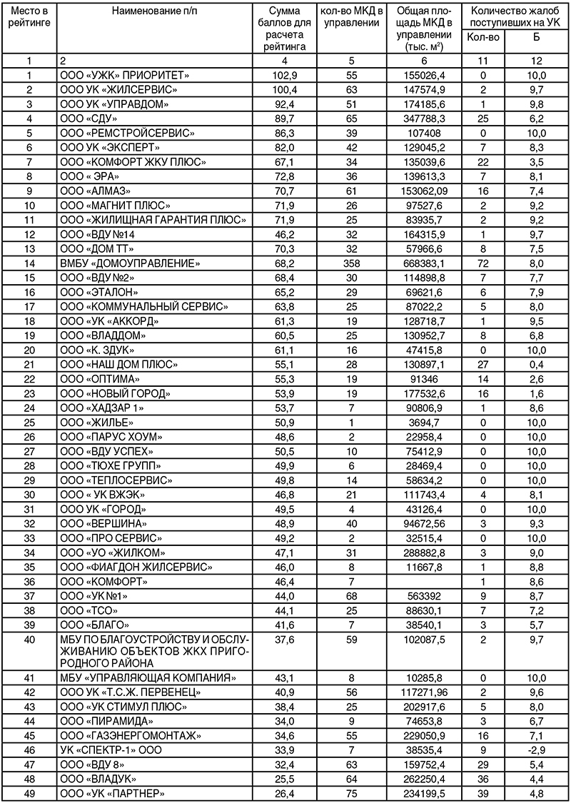 – Да, такая проблема существует. В связи с низкими платежами УК не могут качественно осуществлять текущий и аварийный ремонт, что является их основной задачей. С другой стороны, жители не платят, потому что не видят результатов работы компании, тут я полностью согласен с жителями. Госжилнадзор настоятельно рекомендовал всем управляющим компаниям в конце года провести собрания жильцов, рассказать, сколько средств было собрано, куда они были потрачены и каковы планы на предстоящий период – у каждого дома свои проблемы. Здесь никто ничего нового не придумал, кроме как общение с людьми. И я, и служба основной задачей на будущий год ставит налаживание максимального контакта с жителями и УК. Соглашусь, что сегодня он недостаточный. Есть компании, которые до сих пор не имеют дежурных сотовых телефонов и своих страниц в соцсетях. Многие работают по старинке и не хотят меняться. Им достаточно 20–30% собираемости с дома и все. Мы от таких будем избавляться. В этом году было принято решение избавиться от 4-х УК. Мы подали им досудебные претензии с конкретным обоснованием, почему служба приняла такое решение – все основывается на заявлениях граждан. Последние полгода мы составляем рейтинг управляющих компаний (см. таблицу – ред.), и он ежемесячно обновляется. В начале каждого месяца выкладываем свежий рейтинг на нашем сайте, в ТГ-канале, на канале в MAX. Любой житель может зайти, посмотреть и понять, какую управляющую компанию он бы хотел видеть в управлении своего дома.
