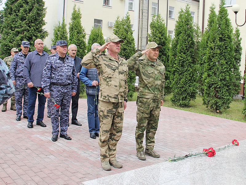 На базе ОМОНа командующий округом и его заместитель вместе с офицерами и ветеранами отряда почтили память погибших при исполнении служебного долга правоохранителей и возложили цветы к посвященному им монументу.