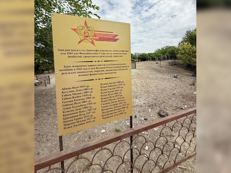 5 апреля 1943 года был составлен акт «О злодеяниях фашистов в селе Комсомольском Кировского района» (документ хранится в Госархиве РСО–А), где обращает на себя внимание эта строчка: «Из всех 105 домов колхозников уцелел только один дом, из остальных – 44 разрушено полностью, 60 разрушены частично и не годны для жилья». Это значит, что населенный пункт в ходе войны был практически стерт с лица земли! В этом же документе зафиксировано, что в результате бомбежек погибли, а также были расстреляны фашистами 28 жителей села – старики, женщины и дети. Кладбище этих невинных жертв расположено в центре Комсомольского, местные жители до сих пор ухаживают за могилами. В прошлом году установили на нем мемориальную доску.