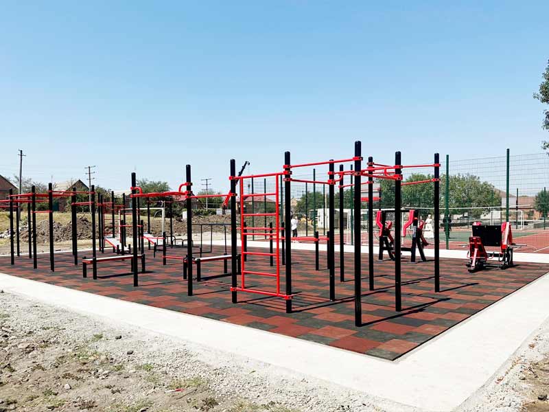 Спортивная площадка оснащена уличными тренажерами и предназначена для занятий футболом, волейболом и баскетболом.