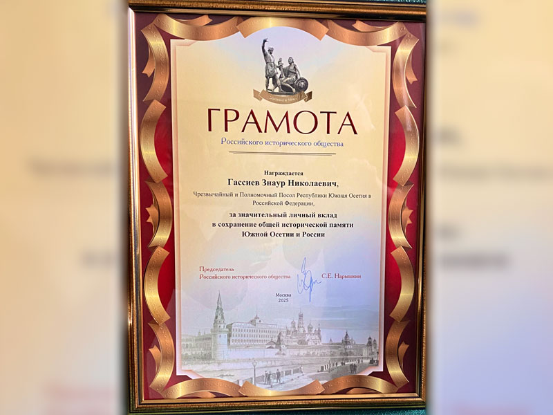 18 июня в Санкт-Петербурге на полях Международного экономического форума Чрезвычайный и Полномочный Посол Знаур Гассиев награжден Почетной грамотой Директора Службы внешней разведки РФ, Председателя Российского исторического общества Сергея Нарышкина за личный вклад в сохранение общей исторической памяти.